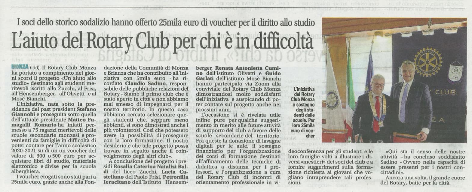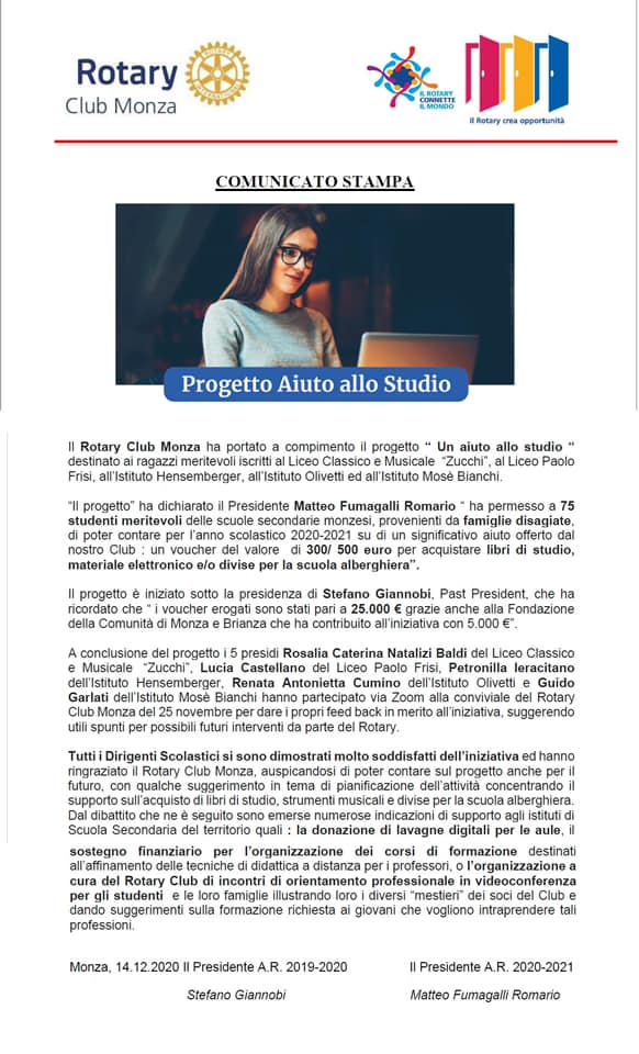 Il Rotary Club Monza porta a compimento il Progetto un Aiuto allo Studio che ha permesso a 75 studenti meritevoli provenienti da famiglie disagiate di avere un contributo per lo studio per l’anno scolastico 2020-21